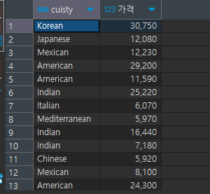 [실습2] 테이블 'food_orders' 칼럼 cuisine_type, price 추출