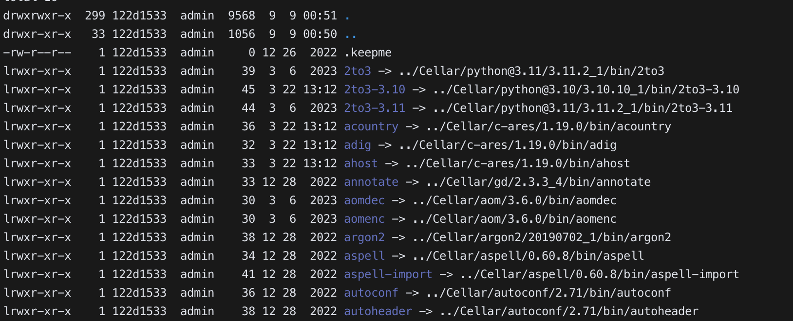 lrwxr-xr-x 1 122d1533 admin 45 3 6 2023 python3.11 -> ../Cellar/python@3.11/3.11.2_1/bin/python3.11