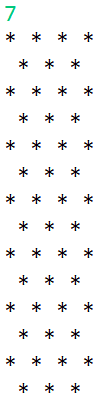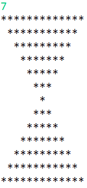 각 줄을 보면 첫번째 줄은 13개, 두번째 줄은 공백을 포함해 12개~대칭점까지는 7개가 되고 그 이후에는 한개씩 늘어난다. 그리고 별의 개수는 13, 11, 9..2개씩 감소하고 공백은 앞쪽에서 하나씩 증가한다.