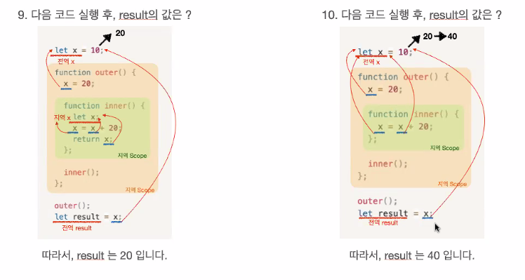- 블록 단위로 스코프를 구분했을 때, 훨씬 더 예측 가능한 코드를 작성할 수 있다. 따라서 let 키워드 사용이 권장됨.