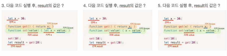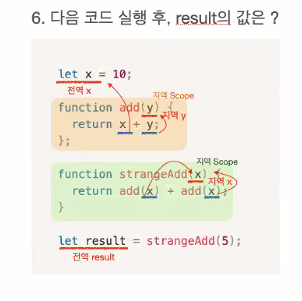 4번문제 set(value)에서 #### x가 선언되지 않았으므로 전역변수가 들어온다. 따라서 전역변수 x = 10이 됟고 get(20)은 10이 된다.