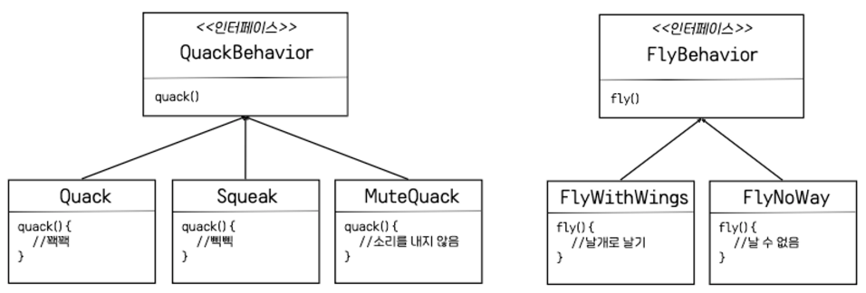 Duck 클래스에 인터페이스 형식의 인스턴스 변수를 추가하고, 각 오래 객체에서 실행 시 이 변수에 특정 행동 형식의 레퍼런스를 다형적으로 설정하여 사용하게 되는 것이다.