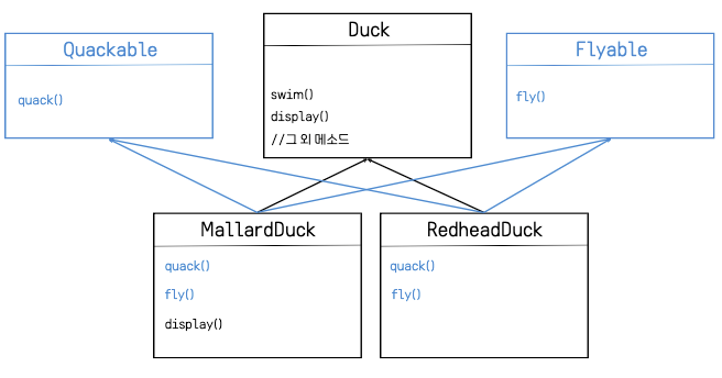 그럼 이 구성을 사용해서 아까 본 상속 구조를 재구성해보자. 우선 위에서 만든 인터페이스는 Duck 이라는 추상 클래스를 구현할 때 다음과 같이 사용 가능하다.