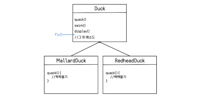 위 그림과 같이 Duck 클래스를 상속받은 서브 클래스가 있는 상태에서 Duck 클래스에 새로운 메소드 fly() 를 추가한다면 어떻게 될까?