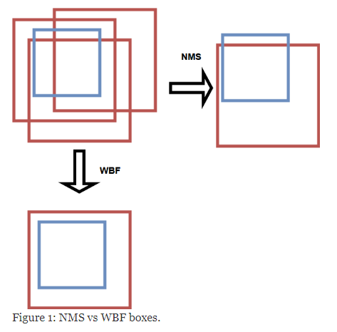 NMS는 부정확한 box를 제외하고 하나의 box를 집어내는 방식이라면 WBF는 여러개의 box의 정보 모두를 사용해서 최종 box를 집어내는 방식.