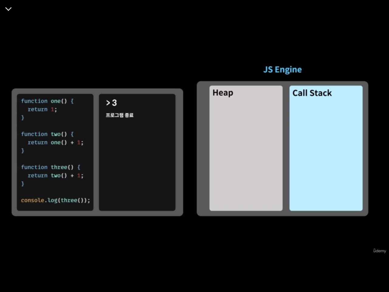 그런 뒤에 one()에 해당하는 값이 반환되어 콜스택을 나가고, two(), three도 마찬가지 과정을 거치면서 콜스택을 나간다.