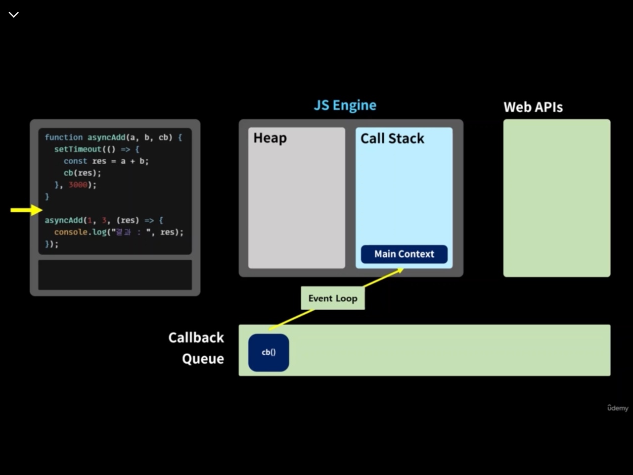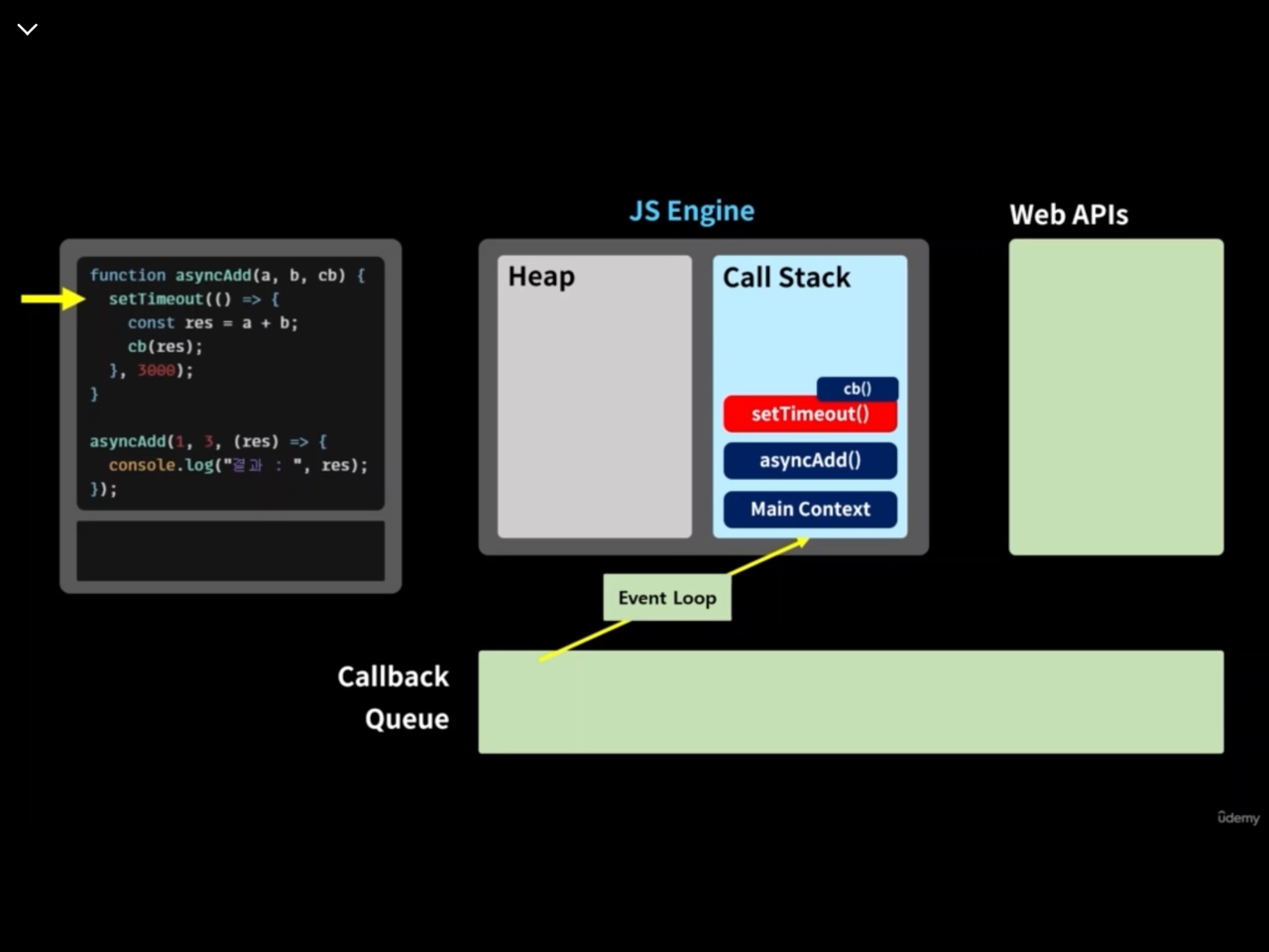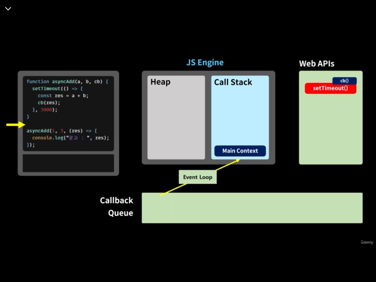 Web API에서 시행을 완료한 setTimeout()은 cb()남긴다. cb()은 Callback Queue로 이동하며, Event Loop를 통해 다시 콜스택으로 진입하여 시행된다. 그리고, 프로그램이 종료된다.