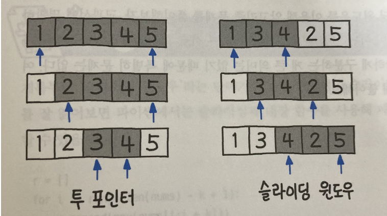 위 이미지를 참고하여 보면, 투 포인트 알고리즘은 구간의 넓이가 조건에 따라 유동적으로 변하며, 슬라이딩 윈도우 알고리즘은 항상 구간의 넓이가 고정되어 있다는 차이점이 있습니다.