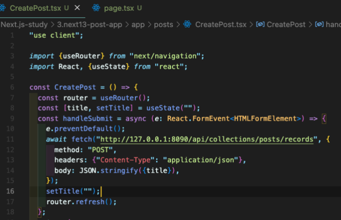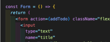 눈여겨볼점은 data.get('title')이 모냐는거다. 이게 모냐면 form에서 action={addtodo}이렇게 하고있으면 form내부의 정보를 addtodo로 전달? 을 해준다. 위에서는 form내부의 input중에 name이 title인 태그의 value를 get메소드를 사용해서 title에 저장하고 있는거다.