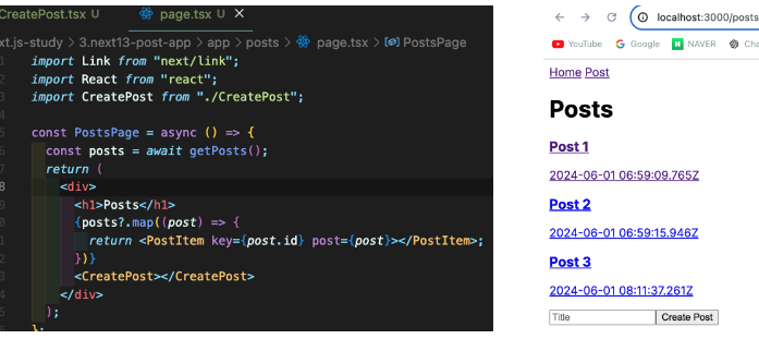 또 revalidatePath는 뭐냐면 이게 CSR이 아니다 보니 뭘 추가해도 화면이 바로 안바뀌는데 그것은 현재 화면이 캐시되어 있기 때문이다. revalidatePath를 사용하면 지금 받은 값으로 새롭게 캐시를 해준다.(캐시를 해주는거니까 refresh랑은 다르다.)