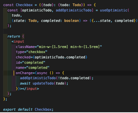 (정확하지않다) 내가 이해한걸로는, (설명을 안해주셨다) todo를 받아서 그걸 기반으로 새로운 객체로 만들고 그걸로 optimisticTodo라는 상태를 만든다.onChange가 일어나면 todo를 바꾸고 있는데, optimisticTodo도 todo를 기반으로 만들어지고 있기 때문에 변하게 된다. 그리고 그걸 사용해서 checked 여부를 보여주고 있으니까 통신의 끝 여부와 상관없이 일단 화면이 업데이트 된다.