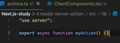 컴포넌트 내부의 myAction함수는 이제 서버액션으로 동작한다. 이것은 서버컴포넌트에서 사용하는 방법이다.