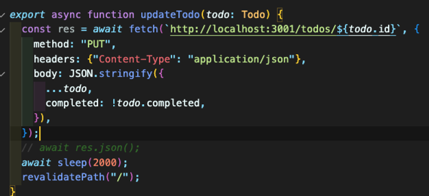 즉 UI는 통신의 완료 여부와 상관없이 일단 업데이트 되어있고 통신은 따로 돌아가고 있는거다. 실제로 updatetodo 내부에는 아직 아까 줬던 sleep함수가 들어있는데도 체크박스를 누르면 ui에 바로 반영되더라.
