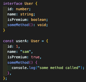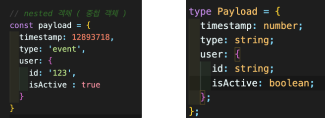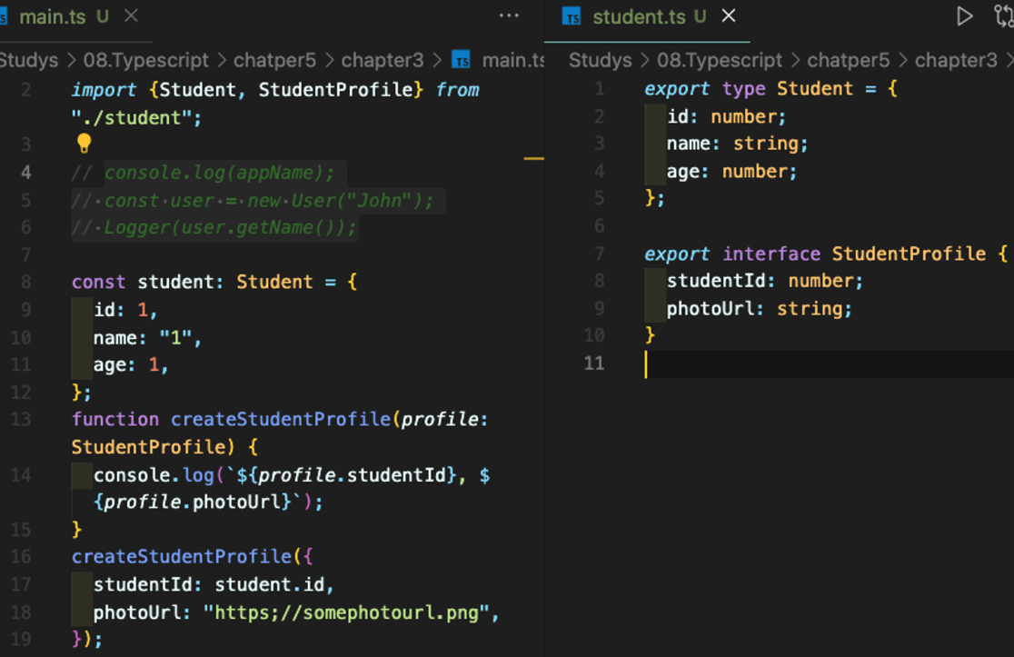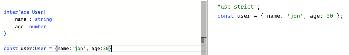 왼쪽이 ts코드이고 오른쪽이 컴파일된 js코드이다. (interface는 객체의 구조를 정의하는 방법이다. 객체가 가져야 할 속성 및 메서드를 명시적으로 선언 한다.)