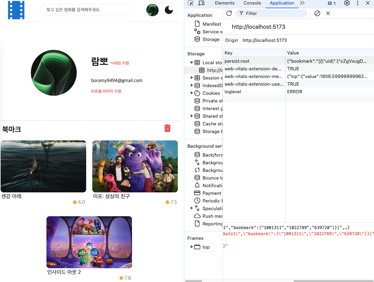 북마크가 되어 있는 것들은 localstorage에 저장이 되고, 영화 디테일 페이지에 들어가면 그것을 참조해서 값이 존재하면 북마크표시가 빨갛게 나오도록 만들었는데, 분명히 mypage에서는 영화가 보이는데 디테일 표이지로 가면 북마크표시가 회색으로 나타나는 것이었다. 그래서 살펴보니까 드래그를 하는 시점에 저장된 값이 숫자가 된다는걸 발견했고..