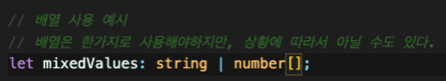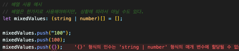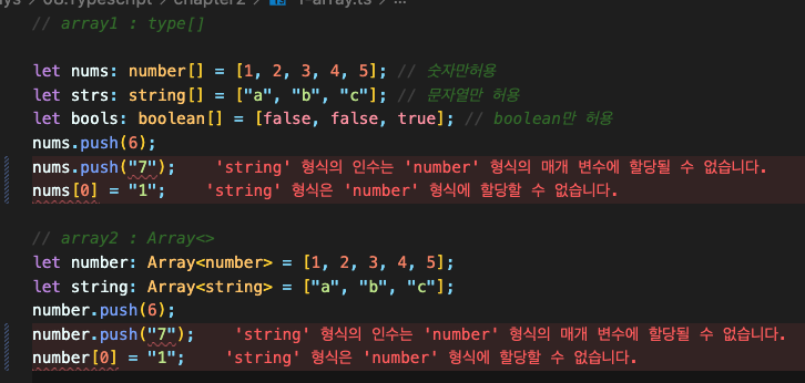 배열은 위 두가지 방법으로 나타낼 수 있다. 타입스크립트에서 배열은 배열의 모든 요소가 동일한 타입을 갖도록 명시하고, 배열 내부 요소의 타입 안정성을 제공한다. 다른 타입의 값을 넣으려고 하면 정적타입체킹이 동작해서 오류가 난다.