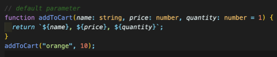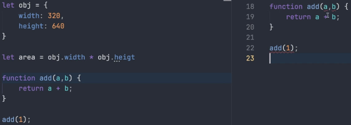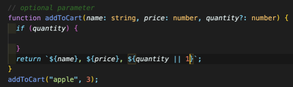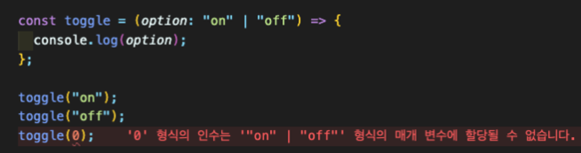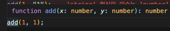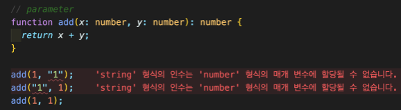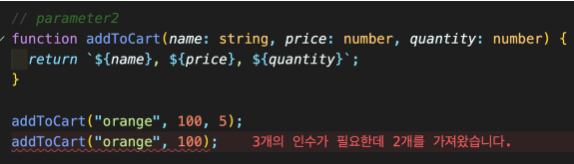 js의 경우 파라미터를 하나 덜 넣어도 오류가 나지 않지만, ts의 경우 오류가 난다. 또한 어떤 오류가 발생했는지를 확인 할 수도 있다. ( 위의 예제들도 마찬가지 )