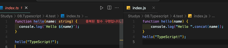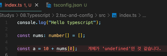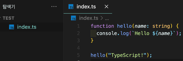 터미널로 돌아와서 tsc index.ts를 실행하면 ts코드를 js코드로 변환하는 컴파일 과정이 실행된다. (브라우저나 node.js에서는 결국에 javascript만 실행 될 수 있기 때문에 ts를 js로 변환시키는 과정이 필요하다. tsc는 TypeScript Compiler를 뜻한다. )