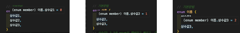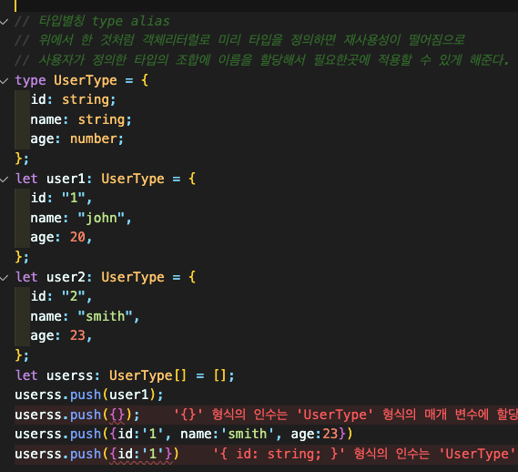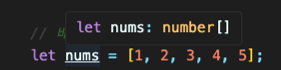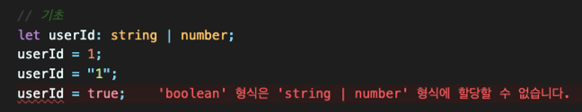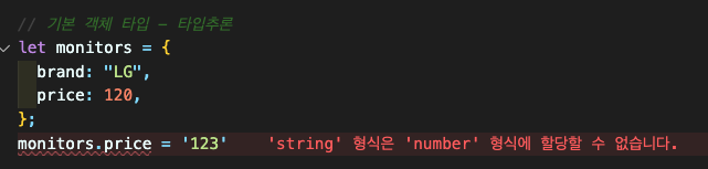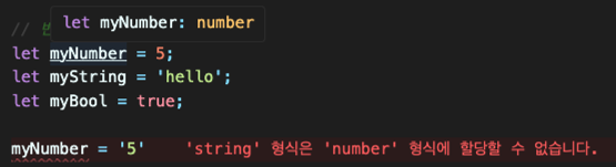 타입 추론 : 변수가 타입 없이 선언되면, 그 값에 기반하여 타입을 추론하는 기능을 제공한다. (그래서 명시적으로 작성하지 않았어도, ts가 추론한 타입과 맞지 않은 값을 할당하려고 하면 오류가 발생한다.)