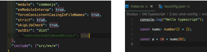 켜져있으면 오류를 발생시킴 -> 사용하는게 좋다. ( strict와 noUncheckedIndexedAccess는 웬만하면 true로 사용해라 )