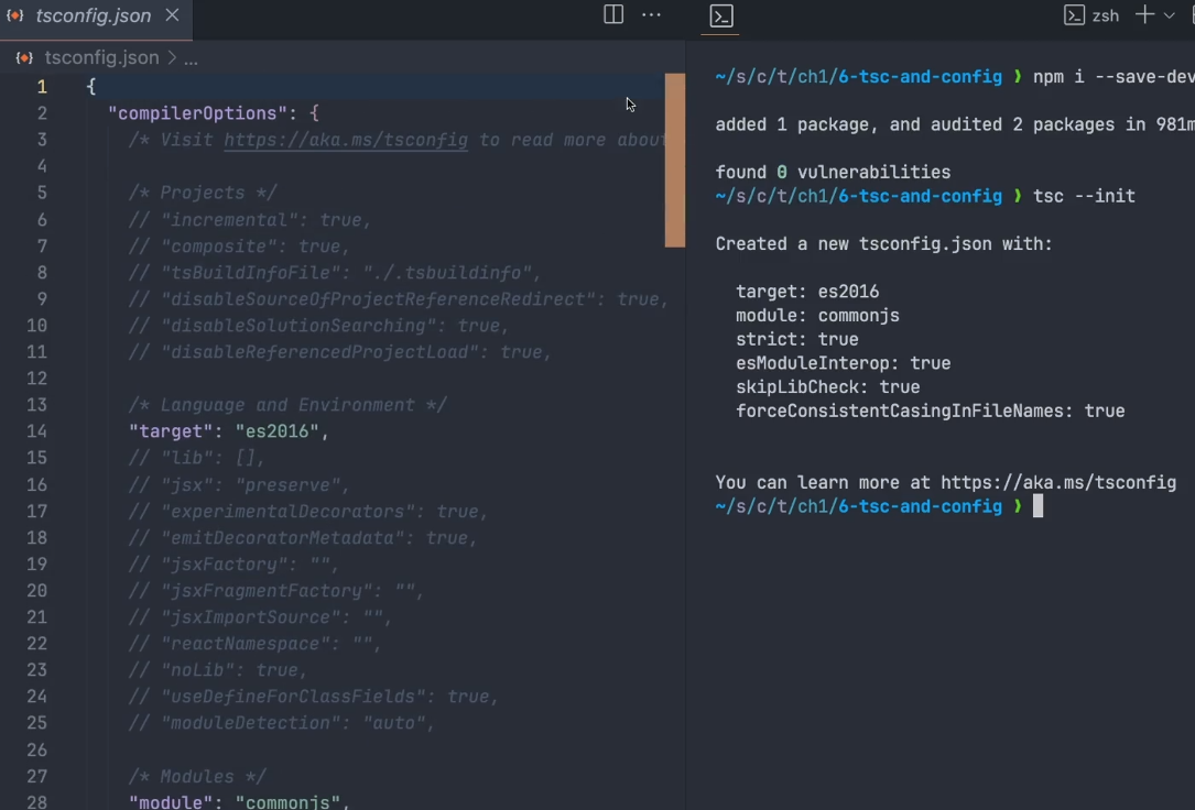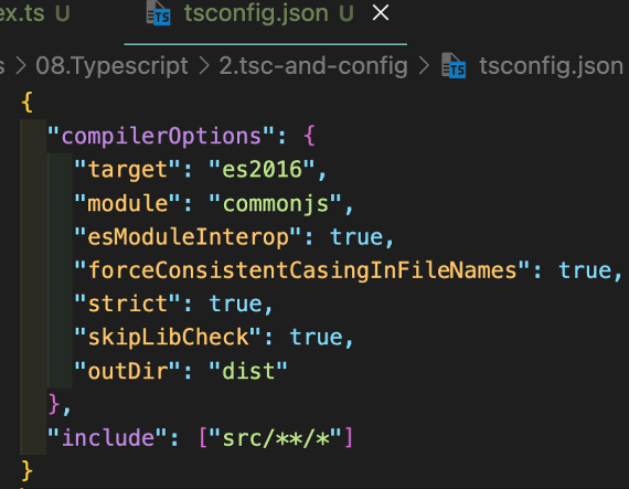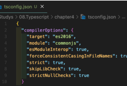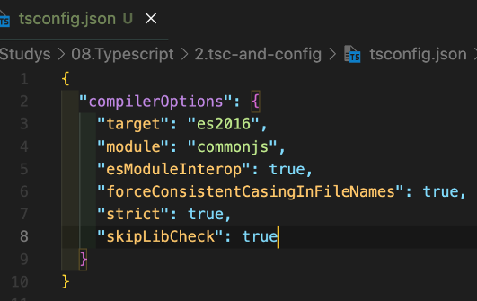 이때 어떻게 컴파일 될것인지 설정값을 줄 수 있고, 그것은 tsconfing.json파일을 통해서 이뤄진다.