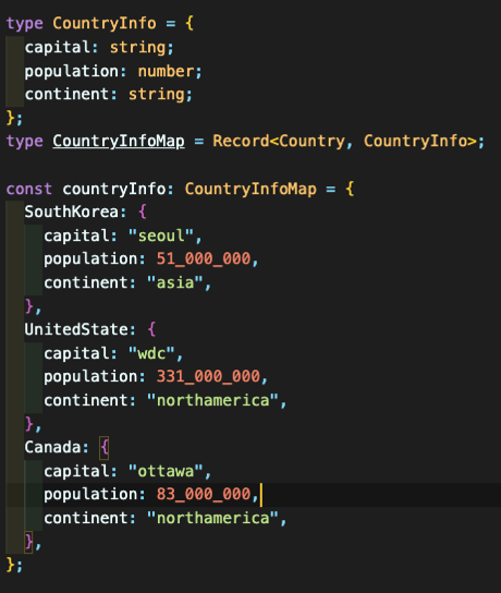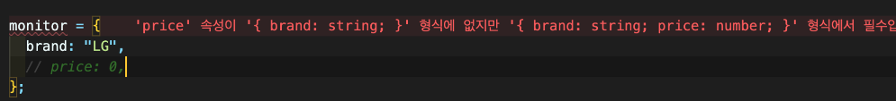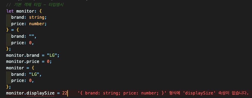 객체의 각 속성과 해당 속성의 타입을 명시적으로 정의해야한다. 없는 값에 접근할 수 없다. 위와 같이 객체 리터럴로 객체를 표기할 때는 값을 줘서 초기화를 하고 나서 값에 접근해야 오류가 나지 않는다.