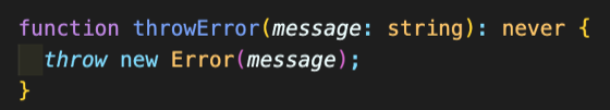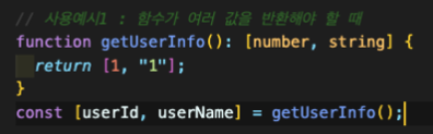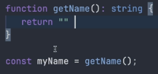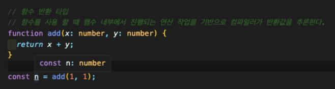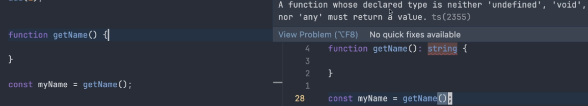이렇게 함수명의 괄호 옆에 타입을 지정하면 해당 함수가 반환할 값의 타입을 명시 할 수 있다. return이 없는 함수는 undefined를 반환하게 되고, js는 이것을 오류가 없지만, ts는 string을 반환해야 하는데 undefined를 반환하고 있기 때문에 오류가 난다.