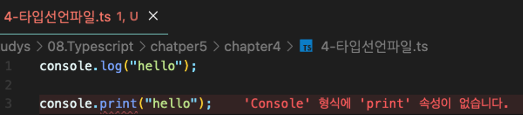 print라는 메서드는 없다. vscode에서 이렇게 정보를 알려주는 것도 vscode가 ts를 내장하고 있기 때문이다. 그런데 ts도 없는걸 알 수는 없다. ts는 내장 객체를 설명하는 선언파일에서 참조를 하는 것이다.