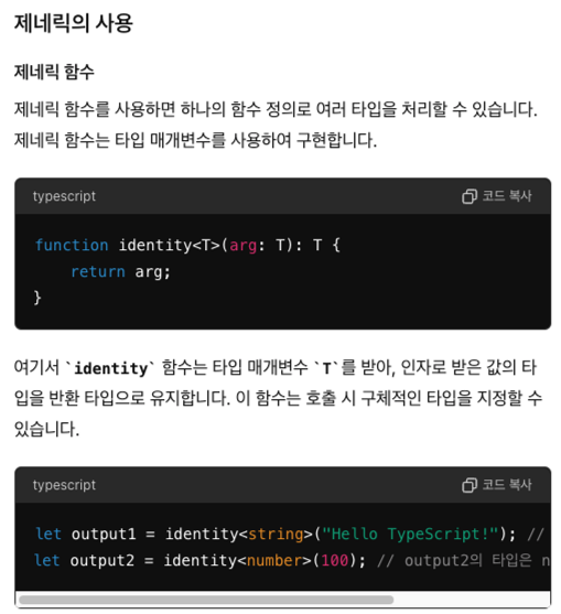 제네릭 generics : 타입 매개변수(ex. <T>)를 사용하여 다양한 타입에 대해 동작하는 코드도 만들 수 있음.