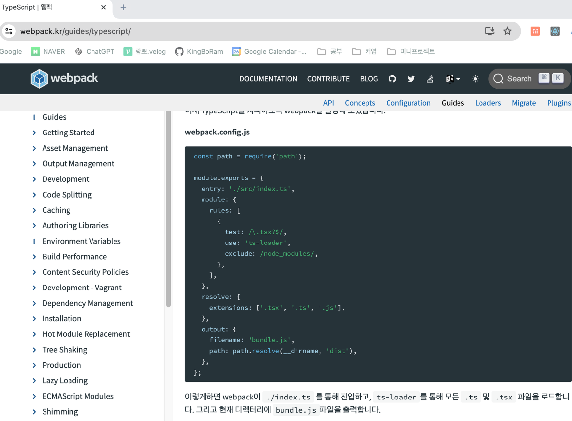 웹팩 공식 홈페이지에 가서 다큐멘트 -> 가이드 -> 타입스크립트를 선택하면 공홈에서 작성해야하는 내용을 제공해준다.