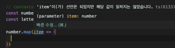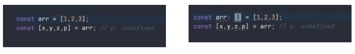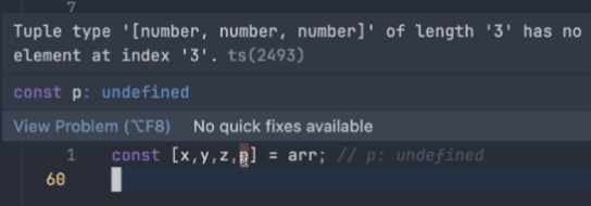디스트럭처링 할 때, js는 값이 하나가 없어도 오류가 안나지만, ts는 오류를 발생시킨다. 일단 type을 명시하라는 오류이며