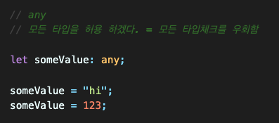 any는 어떠한 타입의 값도 할당이 가능하고, 어떤 메소드도 호출이 가능하다는 의미이다. 하지만 이것을 사용하면 타입의 안정성이 감소하고 타입스크립트를 사용하는 의미가 퇴색되기 때문에 쓰지 않는것을 추천한다.