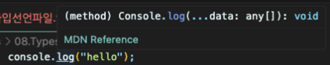 log에 마우스를 올려보면 console의 메서드이고 any type의 data라는 변수를 받는것을 볼 수 있다.