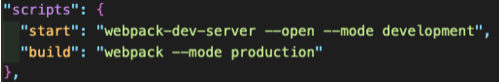 start는 웹팩데브서버를 사용한다. 오픈은 브라우저를 자동으로 열어주는거고 모드는 현재 개발모드라는 뜻이다. 개발모드일때는 소스 맵을 생성한다던가 빌드 시간이 빠른 등 개발자에게 유용한 기능을 활성화 한다.
