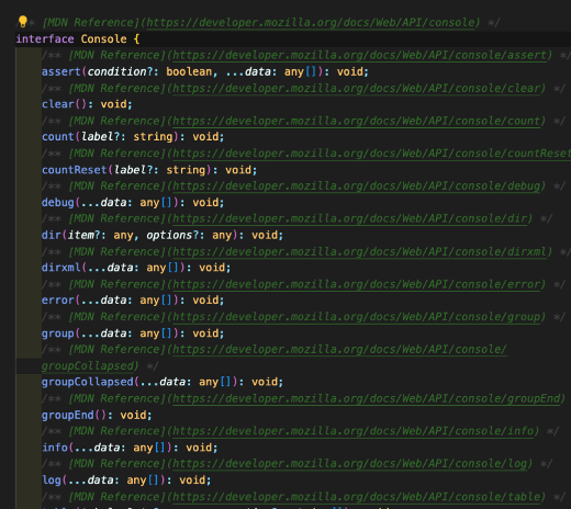 console을 우클릭해서 정의로 이동하면 Console interface를 확인할 수 있다. 구현부로 이동되면서 console의 다양한 메서드를 확인할 수 있다. 파일명을보면 lib.dom.d.ts