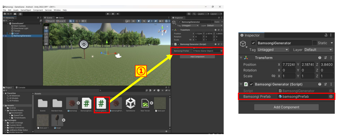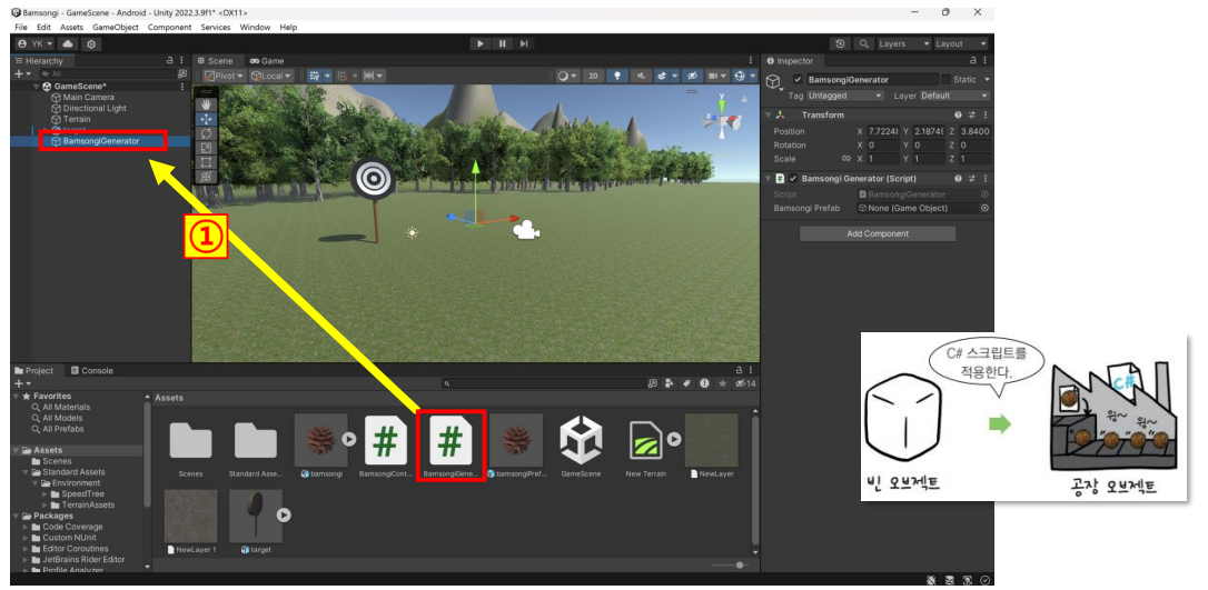 ▪ Project 창에 있는 BamsongiGenerator 스크립트를 Hierarchy 창에 있는 BamsongiGenerator 오브젝트로 드래그&드롭