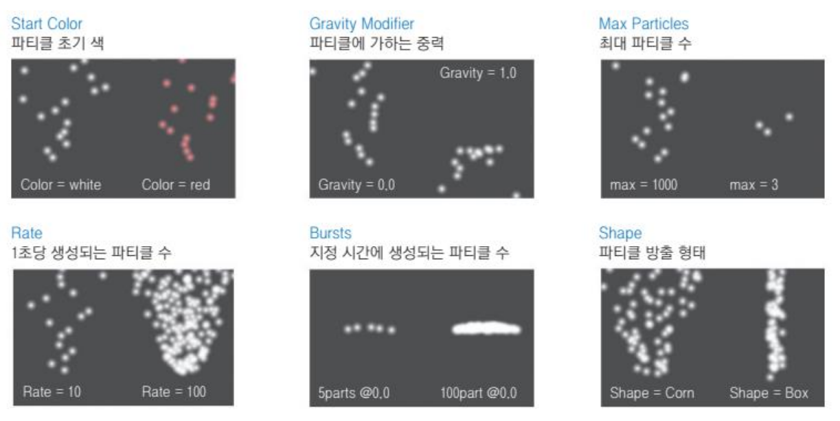 ▪ 유니티에서는 파티클을 컴포넌트로 제공하므로 이러한 매개변수를 에디터에서 쉽게 편집할 수 있음