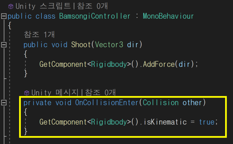 ✓ 닿는 순간 Rigidbody 컴포넌트의 isKinematic을 true로 설정