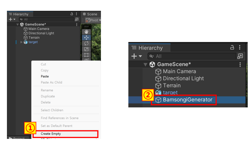 ▪ Hierarchy 창에서 BamsongiGenerator를 클릭하고,