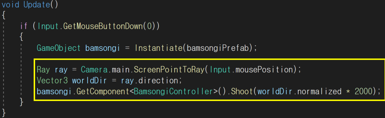 ✓ 날리는 방향을 지정하려면 BamsongiController에 구현한 Shoot 메서드의 매개변수에 날리고자 하는 방향의 벡터를 전달