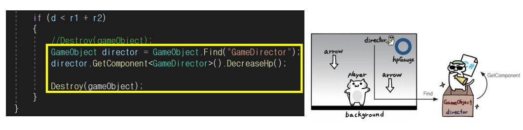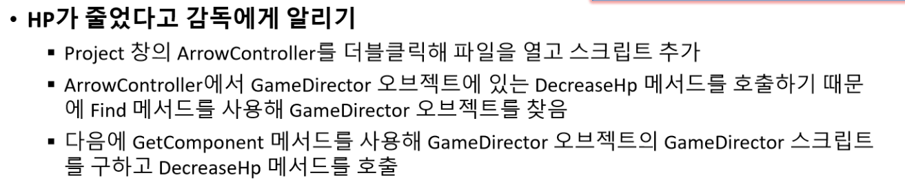 ▪ ArrowController에서 GameDirector 오브젝트에 있는 DecreaseHp 메서드를 호출하기 때문에 Find 메서드를 사용해 GameDirector 오브젝트를 찾는다.
