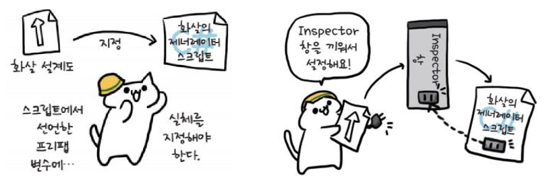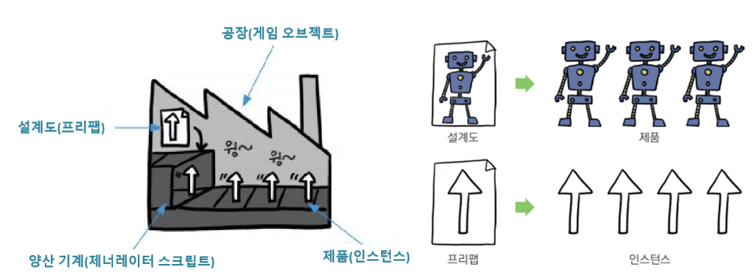 즉, 설계도(프리팹)을 양산 기계(제너레이터 스크립트)로 넘기면 설계도대로 제품 (인스턴스)을 생산한다.