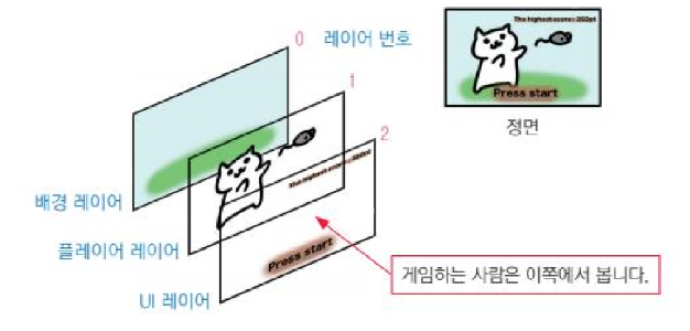 -레이어 번호가 클수록 화면 앞쪽(겉)에 표시되고 작을수록 화면 뒤쪽(속)에 표시된다.