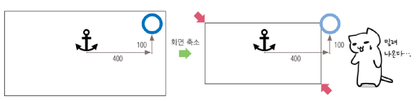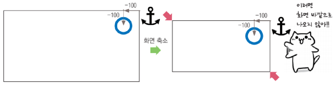 -UI 오브젝트 위치 앵커 포인트를 화면 오른쪽 위 → 실행 기기 화면 크기에 의존X → O