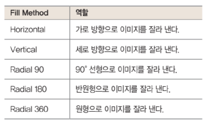 ▪ 게이지를 표시하는 방법에는 원형으로 이미지를 잘라 내는 방법 말고도 상하 방향(Horizontal), 좌우 방향(Vertical), 선형(Radial)으로 게이지를 만드는 방법 등 여러 방법이 가능하다.
