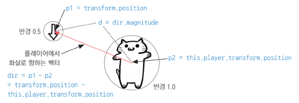 float d = dir.magnitude; // 벡터의 길이 -> magnitude 사용해서 계산