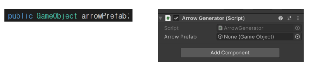 1단계로 콘센트 구멍을 만들어야 하는데, 이미 ArrowGenerator 스크립트에서 설계도를 나타내는 변수 arrowPrefab에 public 접근 수식자를 붙여 선언했다.