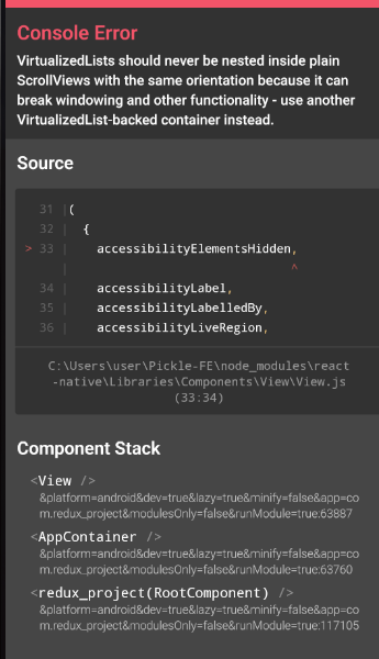 ScrollView 내에 FlatList 또는 SectionList와 같은 VirtualizedList를 중첩하여 사용할 수 없다는 의미이다.