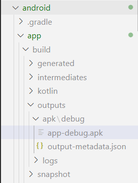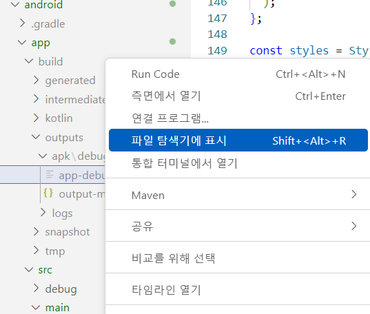 android/app/build/outputs/apk 아래에 app-dubug.apk를 우클릭하고 파일 탐색기에 표시를 클릭한다.