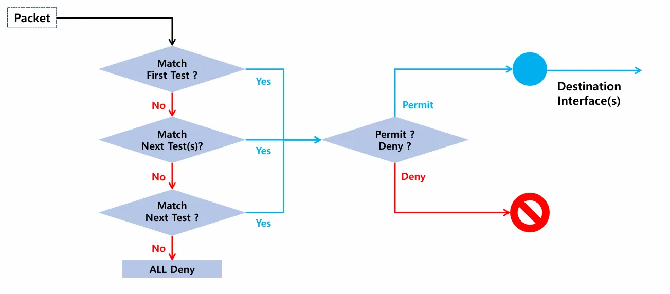 ACL(Access Control List)은 네트워크 트래픽을 필터링하는 규칙 목록, 라우터나 스위치에서 어떤 패킷을 허용(permit)할지, 차단(deny)할지 정하는 기준 역할을 한다.